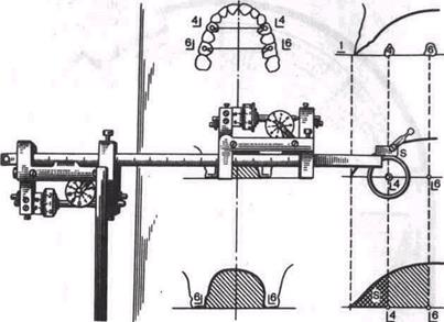 Рис. 4.7. Определение площади неба с помощью планиметра. сальных и сагиттальных кривых [Яворовская А. И., 1948; Хо-рошилкина Ф. Я., 1970]. Полученные результаты сопоставляют с данными, характерными для ортогнатического прикуса. Кроме того, сравнивают форму и размеры сагиттальных и трансвер-сальных контуров неба детей с зубочелюстными аномалиями их родителей, что позволяет выявить их подобие или различие. Для определения площадей неба в сагиттальной и трансвер-сальной плоскостях на уровне 4 | 4 и 6_1_6, ограниченных окклюзионной плоскостью, применяют метод планиметрии. С этой целью используют полярный планиметр для определения площадей плоских фигур (рис. 4.7). Полученные данные сравнивают со средними нормами. По выявленному различию судят о степени нарушения формы альвеолярного отростка челюсти. К техническим достижениям изучения зубоальвеолярных отклонений относят графический способ исследования с помощью компьютера, а также прямой сбор цифровых данных Двухмерным или трехмерным [Van der Linden F. P., 1970] путем. В ортодонтии и детской стоматологии для быстрого и точного расчета диагностических данных, а также для прогнозирования развития зубочелюстной системы можно применять ортодонтометр. Его аналогом являются диагностические табли-Ubi, а прототипом — ортометр Коркхауза. С помощью ортодон-тометра врач быстро и в достаточном объеме получает инфор-