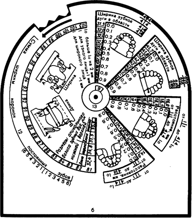 Рис. 4.8. Продолжение. На лицевой стороне ортодонтометра (диск «а») находят размер суммы коронок верхних резцов SI, соответствующий Si, с учетом глубины резцового перекрытия (в частности, сектор 1 — прикус ортогнатический, сектор 2 — прямой, сектор 3 — глубокий (см. нижнюю половину диска). В верхней половине диска обозначены нормальные размеры боковых сегментов зубных дуг (L), соответствующие определенным размерам Si (в секторе 5 при ортогнатическом прикусе, в секторе 6 — при прямом, в секторе 7 — при глубоком). В секторах 4 и 8 обозначены суммы ширины коронок постоянных клыков и премоляров для нижней (4) и верхней (8) челюстей, прогнозируемые по Si, и процент вероятности полученных данных. На оборотной стороне ортодонтометра (диск «б») справа находят нормальную ширину зубных дуг в области 414 (сек- 4|4" тор 9), 6 | 6 (сектор 10), длину переднего отрезка верхней зуб- 6|^ ной дуги (сектор 11), длину переднего отрезка нижней зубной дуги (сектор 12), соответствующие Si при ортогнатическом прикусе. На левой стороне диска определяют длину и ширину апикального базиса нижней и верхней зубной дуги, исходя из суммы ширины коронок 12 зубов (сектор 13). Пользуясь ортодонтометром, можно определить: 1) пропорциональность размеров верхних резцов нижним резцам в пределах 19—25, 9 мм с точностью до 0, 1 мм при нормальном, прямом и глубоком прикусах; 2) длину боковых сегментов зубных дуг, пропорциональную сумме размеров нижних резцов; 3) ширину зубной дуги в области первых премоляров; 4) ширину зубной дуги в области первых моляров; 5) длину переднего отрезка верхней зубной дуги; 6) длину переднего отрезка нижней зубной дуги для нормального, широкого и узкого лица; 7) ширину и длину апикального базиса верхней и нижней зубных дуг в зависимости от суммы размеров 12 постоянных зубов. Кроме того, можно определить необходимое место для постоянных клыков и премоляров до их прорезывания по сумме ширины коронок нижних резцов с точностью от 5 до 95%, а следовательно, установить показания к удалению отдельных зубов при значительном дефиците места. Для удобства пользования ортодонтометром выбраны оптимальные значения суммы ширины коронок нижних резцов от 19 до 25, 9 мм и суммы ширины 12 постоянных зубов от 81 до 104 мм. В информационную основу ортодонтометра заложены сведения по описанным выше диагностическим методикам. Следует подчеркнуть, что изучение моделей челюстей не всегда позволяет получить информацию, достаточную для постановки диагноза. Для уточнения средней индивидуальной нормы, установления гнатических форм зубочелюстных аномалий требуются другие лабораторные методы. Они могут быть самостоятельными или сочетаться с изучением диагностических моделей челюстей. Глава 5