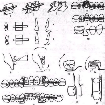 Рис. 11.1. Аппарат Энгла сложной конструкции (эджуайз-техника). I—7 — замковые приспособления с прямой (1, 5, 7) и косой (6) прорезями и расположение круглых и четырехгранных дуг в замковых приспособлениях (1, 2, 4, 7); 8—10 — расположение дуги для перемещения отдельных зубов; II—12 — форма и положение дуги для зубоальвеолярного удлинения (11) и укорочения (12); 13—16 — форма и расположение конца дуги в опорной трубке на моляре.