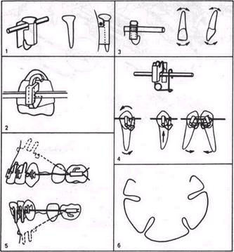 Рис. 11.4. Бегг-техника. I, 2, 3 — замковые приспособления с горизонтальной прорезью для круглых дуг и шплинты; 4 — пружины для поворота зубов и их фиксации в замковых приспособлениях; 5, 6 — формы зубной дуги для перемещения зубов. вающийся ортодонтический замок RM с ввинчивающимся болтом и др. Для укрепления ортодонтических дуг Ю. М. Малыгиным, Л. М. Тышковским и А. П. Егоровым (1974) предложены универсальные замковые приспособления и штампы для их изготовления. Их готовят из листовой хромоникелевой стали толщиной 0, 2 мм. Они представляют собой гибкую пластину с Н-образной опорной площадкой и двумя петлями, расположенными одна против другой. С помощью этих петель закрепляют ортодонтические дуги (одну—три), зацепляют металлические лигатуры, пружины и резиновые кольца. Размеры фиксирующего элемента замка позволяют использовать стандартную дугу Энгла. Большая опорная площадка обеспечивает надежную опору
