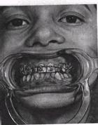 Рис. 11.5. Аппарат «Унорт», укрепленный на зубах верхней челюсти. фиксирующего элемента при приварке или припайке к металлическому кольцу: а также при его приклеивании непосредственно к эмали зуба (рис. 11.5). Приспособления для лингвальных дуг— специальные замки, которые припаивают или приваривают к опорным кольцам обычно на первые постоянные моляры. Наиболее простой конструкцией являются полукруглые лин-гвальные замки. При введении конца дуги полукруглый захват замка слегка отгибают, затем он принимает прежнее положение и удерживает дугу. Другие конструкции сложных замков (замки Мершона, Шторка) состоят из одной или двух вертикальных трубок с опорной площадкой. На концах лин гвальной дуги делают направляющие или фиксирующие отростки, которые вставляют в замок, где их зажимают с помощью откидной петли или других дополнительных элементов. Дополнительные опорные и фиксирующие приспособления. Упоры на кольцах используют для наилучшего припа-совывания их к зубам при примерке и цементировании. Они препятствуют соскальзыванию лигатур и пружин с перемещаемых зубов, а также щипцов или корон коснимателя при снятии колец. Крючки (круглые, плоские, одинарные, двойные и др.), " етли, кнопки применяют для закрепления проволочной или резиновой лигатуры на кольце, укрепленном на перемещаемом зубе. Язычная штанга (касательная) представляет собой отрезок проволоки диаметром 0, 8—1, 2 мм, припаянный к язычной поверхности кольца для опорного зуба, передающий и Распределяющий давление на зубы, к которым он прилегает (например, в аппарате Айнсворта). Штангу используют также Для ретенции положения зубов после их выведения из небного положения или поворота по оси. Рычаги применяют для мезиодистального наклона и °Рпусного перемещения зубов. Их делают из проволоки ди- аметром 1—1, 2 мм, длиной 15—20 мм, которую расплющивают и контурируют по форме вестибулярной поверхности зуба и альвеолярного отростка. Распорки используют для сохранения места в зубном ряду после ранней потери зубов или для установления в правильное положение зубов, сместившихся в сторону дефекта Изготовляют распорку из проволоки диаметром 0, 9—1, 2 мм в виде П-образной скобы, длина которой должна соответствовать длине дефекта зубной дуги. Концы распорки припаивают к кольцу для опорного зуба. Направляющие штифты препятствуют нежелательному наклону перемещаемых зубов. Они могут быть самостоятельной деталью либо частью другой детали ортодонтического аппарата (распорки, лингвальной дуги и др.). Б ю г е л и — опорные детали некоторых ортодонтических аппаратов и зубочелюстных протезов. Их делают гнутыми из проволоки или литыми. Упор для языка применяют с целью устранения вредной привычки прокладывания его между зубными рядами. Упор изгибают из ортодонтической проволоки диаметром 0, 7—0, 8 мм по форме язычной поверхности переднего участка зубных дуг, чтобы он не препятствовал смыканию зубов и не травмировал слизистую оболочку подъязычной области. Упор припаивают к опорной небной дуге или укрепляют в базисе съемной пластинки. Наклонные плоскости являются действующими деталями функционально-направляющих ортодонтических аппаратов, служащими для исправления положения зубов или перемещения нижней челюсти. Они могут быть гнутыми, литыми, съемными или несъемными. Дуги и пружины для 