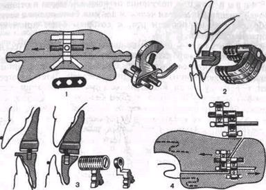 Рис. 11.10. Разновидности ортодонтических винтов для нормализации прикуса. 1 — скелетированный расширяющий винт для активаторов; 2 — винт Вайзе для активатора Вундерера; 3 — винт для активаторов; 4 — реципрокный винт Веллера для регулятора функции Френкеля. Третья группа — для нормализации прикуса: скелетированный обычный и специальный винты, винт Вайзе, винт Френ-цена, реципрокный винт с V-образной направляющей и опорными бюгелями, реципрокный винт Веллера (рис. 11.10). Моделировка базисов съемных ортодонтических аппаратов и способы их изготовления из пластмассы. Базисная пластинка является основой съемных аппаратов и зубных протезов. Как самостоятельный аппарат она применяется для ретенции достигнутых результатов ортодонтического лечения. Конструкция, состоящая из базисной пластинки с активно действующими элементами, относится к одночелюстным механически-действующим аппаратам. К базисной пластинке могут быть присоединены функционально-направляющие детали. При укреплении на верхней и нижней базисных пластинках резиновой тяги или пружин они превращаются в механически действующие аппараты межчелюстного действия. Базисные пластинки, соединенные в единый блок, являются основой конструкции двухчелюстных функционально-направляющих и Функционально-действующих блоковых и каркасных съемных аппаратов. Изготовление базисной пластинки делится на два этапа. Первый этап— получение оттиска с челюсти и отливка рабочей модели. На модели челюсти должны быть полно и четко отображены ткани полости рта, к которым будет прилегать базисная пластинка. Второй этап— изгибание фиксирующих механически-действующих проволочных деталей. Перед моделировкой базисной пластинки на модели челюсти с помощью расплавленного воска укрепляют концы проволочных деталей Затем разогревают пластинку воска и плотно обжимают ею поверхность гипсовой модели. При изготовлении базисной пластинки для верхней челюсти покрывают воском небо, небную поверхность зубов до уровня их жевательной поверхности и режущих краев передних зубов Задний край базиса заканчивают на линии, соединяющей дистальные поверхности последних моляров. Отличие моделировки базисной пластинки для нижней челюсти состоит в том, что, кроме передней, боковой и задней, она имеет нижнюю границу, расположенную в подъязычной области на месте перехода альвеолярного отростка в дно полости рта. При наклоне боковых зубов в язычном направлении в этой области край пластинки утолщают, предусматривая последующую коррекцию аппарата при его припасовывании в полости рта. В переднем участке базисной пластинки делают выемку для уздечки языка. Метод горячей полимеризации пластмассы является основным при изготовлении ортодонтических аппаратов- из пластмассы. Съемный аппарат, смоделированный из воска, гипсуют в кювете, выплавляют воск. Затем формуют базис из пластмассы, обрабатывают термически, отделывают и полируют. Данный метод имеет недостатки: трудоемкость, необходимость предварительной заготовки аппарата из воска, расход вспомогательных материалов (воск, гипс и др.) Для изготовления сложных ортодонтических аппаратов этот способ не всегда приемлем из-за возможности деформации проволочных деталей. Удобнее изготавливать такие аппараты из самотвердеющей пластмассы. Метод холодной поли