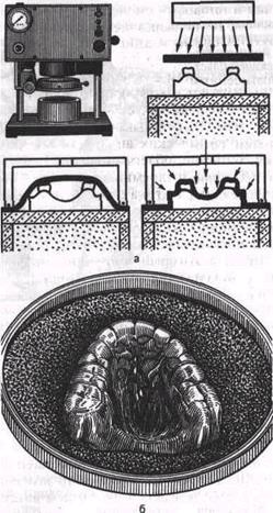 Рис. 11.12. Аппарат для электропневматической штамповки и этапы пневмовакуумного формирования пластмассы (а). Отштампованный аппарат (б). целью на гипсовых моделях челюстей прикрепляют воском металлические детали в тех участках, которые в дальнейшем не покрывают пластмассой. При изготовлении двухчелюстных ор-тодонтических аппаратов модели скрепляют в окклюдаторе резиновым кольцом, чтобы они не разъединились. Из пластмассы формируют нужные части аппарата. Первые ее порции наносят шпателем на концы металлических деталей, затем формируют базис, щиты, пелоты; излишки пластмассы удаляют. Заготовленный аппарат вместе с окклюдатором или фиксатором помещают в полимеризатор, заполненный на У., его емкости водой комнатной температуры (18—20 °С). Нужно сле- дить, чтобы части аппарата, смоделированные из самотвердеющей пластмассы, не подвергались воздействию струи нагнетаемого воздуха. Полимеризатор герметически закрывают и давление в нем поднимают до 2, 5—3 ат. Пластмассу выдерживают под таким давлением в течение 45—50 мин, после чего его постепенно снижают и крышку снимают. Готовый аппарат извлекают из полимеризатора, струёй горячей воды смывают воск, снимают с моделей, отделывают и полируют. Такой способ изготовления ортодонтических аппаратов предотвращает возможность их деформации, облегчает труд зубных техников, поскольку исключает ряд трудоемких этапов работы. Метод литья пластмассы. Один из методов изготовления базисов съемных аппаратов. С этой целью используют отечественные или зарубежные аппараты и материалы. Один из таких аппаратов представляет собой модифицированный зубо- технический пресс, в который вмонтировано устройство для выдавливания пластмассы в специальную кювету [Копей-кинВ.Н., 1961]. Метод прессования пластмассы. Применяется для изготовления аппаратов из пластических материалов, которые при разогревании и небольшом на них давлении принимают нужную форму. Методы электропневматической штамповки и пневмовакуумного формования пластмас-с ы. Используются для изготовления ортодонтических аппаратов из твердой и мягкой пластмасс в специальных приборах (рис. 11.12). Эти методы автоматизированные и высокопроизводительные. Пластину пластмассы разогревают до необходимой пластичности, затем на модели челюсти штампуют под давлением. Для улучшения качества штамповки в некоторых конструкциях аппаратов одновременно с созданием давления с наружной стороны пластмассовой пластины создают вакуум с ее внутренней стороны.