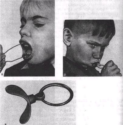 4) применение лечебных сосок, оказывающих давление на чрезмерно развитый участок челюсти, 5) задерживание роста челюсти с помощью пращи, повязки и внеротовой эластичной тяги, 6) борьба с вредными привычками сосания пальцев и другими (накистевые, налоктевые повязки), 7) выявление привычной неправильной позы, нарушенной осанки, плоскостопия, направление на консультацию к ортопеду, 8) нормализация смыкания губ, носового дыхания, распо-339
