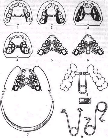 Рис 15 8 Несъемные расширяющие ортодонтические аппараты 1—4 — первая группа, 5—7 — вторая группа, 8, 9 — аппарат Левковича си мости от выраженности сужения верхней зубной дуги и ее апикального базиса 1 • При сужении зубной или зубоальвеолярной дуги до 5 мм по сравнению с индивидуальной нормой показан ортодонти-ческий метод лечения — применение расширяющих пластинок с винтом, пружиной Коффина, аппарата Энгла или эджуайз-техники 2 При сужении зубной или зубоальвеолярной дуги более чем на 5 мм по сравнению с индивидуальной нормой рекомендуйся сочетай ная терапия — хирургическое (компактостеотомия или удаление зубов) и последующее ортодонтическое лечение. 3. При сужении апикального базиса верхней челюсти, равном 37% и меньше (установленном путем измерения диагностических моделей челюстей по методу, предложенному A. Howes), проводится сочетанная терапия — удаление отдельных зубов, компактостеотомия и последующее ортодонтическое лечение или раскрытие срединного небного шва посредством несъемных расширяющих ортодонтических аппаратов, воздействующих на небный шов и положение зубов (первая группа аппаратов) или также на альвеолярный отросток (вторая группа аппаратов) (рис. 15.8). Первая группа — аппараты Стантона, Шродера—Буслера—Норда и др., представляющие собой кольца или коронки, фиксируемые на первых премолярах и молярах, или каппы, фиксируемые на боковых зубах, соединенные между собой литой промежуточной частью и винтом. Вторая группа — аппараты Дерихсвайлера, Шато и др. Это кольца или коронки, фиксируемые на первых премолярах и молярах, соединенные между собой литой или проволочной арматурой, с винтом и базисом или пластмассы, опирающимся на альвеолярный отросток. При раскручивании винта его давление передается на альвеолярный отросток, боковые зубы и способствует изменению формы свода неба. К числу аппаратов, предназначенных для раскрытия небного шва, относят аппарат Норда. Его опоной частью являются спаянные кольца или коронки на вторые премоляры и первые моляры. К коронкам прикрепляют штанги, прилегающие к небной поверхности вторых моляров, первых премо-ляров и клыков, передающие давление на эти зубы в процессе раскручивания расширяющего винта. В случае применения этого аппарата основная нагрузка приходится на зубы, а не на альвеолярный отросток, что приводит к их перегрузке. Аппарат Дерихсвайлера— несъемный расширяющий аппарат, оказывающий воздействие в трансверсальном направлении на зубы, альвеолярный отросток и небный шов. Аппарат состоит из колец или коронок, укрепляемых на постоянных молярах, премолярах, иногда клыках, жестко со-единеных между собой проволочными или литыми дугами, прилегающими с небной стороны к коронкам боковых зубов и распределяющих на них давление. В базисе из пластмассы укрепляют винт и металлическую арматуру. Давление винта при его раскручивании передается на альвеолярный отросток и зубы, что уменьшает неблагоприятную горизонтальную нагрузку на пародонт опорных зубов. Чтобы увеличить площадь опоры, можно присоединять к аппарату касательные к небной поверхности боковых резцов. В базисе аппарата можно укреплять пружины, рычаги для устранения диастемы и перемещения передних зубов. В зависимости от вида сужения применяют винты для равномерного или неравномерного раскрытия небно
