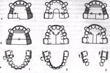 Рис 15.10 Аппараты для удлинения зубных рядов. а, б — съемные пластиночные с секторальными распилами, в — несъемные I — дуга Энгла, 2 — аппарат Герлинга—Гашимова, 3 — укороченные отрезки дуг Энгла с гайками вальными дугами и другими приспособлениями, а также секторальными распилами (рис. 15.10). При раскручивании винта в пластинке с секторальным распилом происходит вестибулярное отклонение резцов и дистальное перемещение боковых зубов под воздействием прилегающих к ним выступов пластмассового базиса, кламме-ров и других приспособлений. Винт располагают параллельно окклюзионной плоскости, его длинную ось устанавливают в направлении перемещения зубов. Распил производят на уровне середины коронок клыков. При выпиливании сектора в пластмассе, равного ширине коронок перемещаемых зубов, важно следить за тем, чтобы стороны распила были параллельными, поскольку это предупреждает заклинивание подвижного сектора. При прямом и открытом прикусе покрывают пластмассой оральную поверхность перемещаемых верхних передних зубов. При обратном резцовом перекрытии передние зубы разобщают с помощью окклюзионных накладок из пластмассы на боковые зубы Секторальный распил в заднебоковом участке позволяет " ри достаточной опоре аппарата перемещать боковые зубы в дистальном направлении, а также в дистально-вестибулярном или оральном, что зависит от расположения винта. Перемещение боковых зубов в дистальном направлении, т. е. в сторону Ьолее широкой части зубной дуги, способствует не только Удлинению, но и расширению зубного ряда. Для удлинения верхнего зубного ряда за счет преимуще. ственно дистального перемещения боковых зубов изготавливал ют пластинку с двумя винтами. Располагают их между клыками и первыми премолярами. После распиливания аппарата образуется большой Т-образный опорный сектор для передних зубов и два сектора меньших размеров для боковых зубов. Неравномерного дистального перемещения боковых зубов достигают раскручиванием одного винта, равномерного удлинения зубного ряда — раскручиванием двух винтов. С целью удлинения нижнего зубного ряда устанавливают два винта между клыками и первыми премолярами. Для дистального перемещения премоляров и моляров применяют как съемные, так и несъемные ортодонтические аппараты — аппараты Энгла с одночелюстной или межчелюстной опорой, капповый аппарат Каламкарова. Кроме того, можно использовать аппарат с межчелюстной и внеротовой опорой. При этом важно правильно выбрать конструкцию ортодонти-ческого аппарата с учетом биомеханических принципов активного и реактивного силового воздействия. Для двустороннего дистального перемещения верхних боковых зубов целесообразно использовать лицевую дугу с внеротовой опорой на затылке или шее. Р. Г. Гашимов и С. И. Хме-левский рекомендуют соединять назубную и лицевую дуги аппарата не в одной плоскости, а под углом, чем достигается прямолинейное и вращательное силовое воздействие на зубы и перемещение их в нужном направлении. Дистальное перемещение премоляров и моляров при постоянном прикусе (после окончания периода активного роста челюстей) представляет значительные трудности. В таких случаях показаны компакто-стеотомия в области перемещаемых зубов или удаление отдельных зубов. Удлинения зубных рядов достигают также путем примен