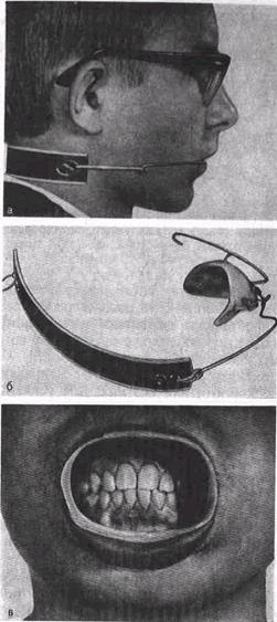 Рис 16 б Лечение активатором Андрезена — Хойпля с лицевой дугой и внеротовой резиновой тягой а — активатор в полости рта, б — активатор с шейной повязкой, в — результаты лечения через 4 года Открытый активатор Кламмта применяют для Учения дистального прикуса с протрузией верхних передних ^бов, наличием сагиттальной щели между резцами до 5 мм
