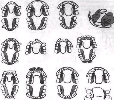 Рис. 16.2. Клинико-морфологические разновидности дистального прикуса по Малыгину. 1 — без деформации зубных дуг; 2 — с боковым смещением нижней челюсти в привычной окклюзии; 3-е тесным положением верхних передних зубов, сужением зубных дуг при нормальной их длине; 4 — с удлинением верхнего зубного ряда, протрузией верхних резцов с тремами без сужения зубных дуг; 5 — с удлинением верхнего зубного ряда, протрузией верхних резцов с тремами рение, а сокращение зубных рядов и создание места для передних зубов за счет удаления отдельных из них, чаще первых премоляров на одной или обеих челюстях. При четвертой разновидности дистального прикуса нередко выявляют вредные привычки (сосание пальцев, прикусывание нижней губы и др.). Если в периоде сменного прикуса соотношение коронок временных клыков правильное, а первых постоянных моляров — бугровое вследствие разницы в величине коронок верхних и нижних временных моляров, не превышающей 2 мм, то после устранения вредной привычки можно рассчитывать на саморегуляцию. При более выраженной аномалии необходимы профилактические и лечебные мероприятия для устранения вредной привычки: психотерапия, ортодонтическая лечебная гимнастика, применение ортодон-тических аппаратов (вестибулярная пластинка, пропульсор Мюлемана, активатор Андрезена — Хойпля и др.). Метод щитовой терапии основан на применении съемных вестибулярных аппаратов (пластинок), которые располагаются между губами и щеками, с одной стороны, зубами и альвеолярными отростками — с другой. При введении такой пластинки-щита в рот разъединяются мягкие ткани, окружающие зубные ряды с наружной и внутренней их поверхности. Вестибулярный щит механически отодвигает мягкие ткани, располагающиеся при аномалиях прикуса между зубными рядами, устраняет препятствие для сближения зубов. Он защищает зубные ряды от давления при вредной привычке сосания пальца, губы или других предметов, препятствует прохождению воздушной струи через рот, нормализует смыкание губ, функцию дыхания и глотания, создает благоприятные условия для расположения и функции мышц околоротовой области (губ, щек, языка) и может быть использован для гимнастических упражнений, тренирующих круговую мышцу рта. В литературе встречаются следующие названия таких аппаратов: вестибулярная пластинка, ротовой (оральный) щит, ротовая (оральная) заслонка. Вестибулярная пластинка Кербитца прилегает к вестибулярной поверхности зубов и альвеолярных отростков, достигая переходных складок слизистой оболочки. A. Korbitz в 1914 г. высказал мнение, что для развития и формирования зубных и сужением зубных рядов, б—с удлинением верхней зубной дуги, протрузией верхних передних зубов и их тесным положением, сужением зубных дуг; 7 — асимметрия верхней и нижней зубных дуг при одностороннем укорочении и расширении зубной дуги с противоположной стороны, протрузия верхних резцов с одной стороны и их ретрузия с другой стороны, 8 — с укорочением зубных дуг, ретрузией верхних центральных резцов и протрузией боковых при нормальной ширине зубных дуг; 9 — с укорочением и сужением зубных дуг и ретрузией всех резцов. рядов большое значение имеет взаимодействие мышц губ, щек и языка. Предложенная им вестибулярная пластинка рекомендуется для нормализации носового дыхания и устранения вредной привычки со