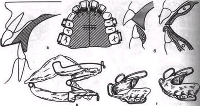 Рис. 16.10. Соотношение зубных рядов и типы формирователей прикуса Бимлера для лечения дистального прикуса, сочетающегося с протру-зиеи верхних передних зубов (а), их ретрузией (б) и для лечения мезиального прикуса (в).