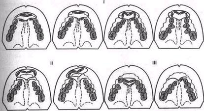 Рис 17 6 Формы (1—111) верхнего зубного ряда при аномалиях прикуса, обусловленных врожденной двусторонней расщелиной верхней губы, альвеолярного отростка и неба (по Ф Я Хорошилкиной) I — суженный зубной ряд; II — вытянутый зубной ряд, III — укороченный зубной ряд зубного ряда и исправлении положения центральных резцов. При их кариозном разрушении и наличии дефектов зубного ряда и альвеолярного отростка в области расщелины ортодонтическое лечение завершают протезированием. Предпочтение отдают съемным протезам. Межчелюстная кость может быть значительно смещена вперед и нередко повернута по оси. При этом передние участки фрагментов верхней челюсти значительно смещаются к средней линии. Сошник бывает изогнут в вертикальном направлении, что увеличивает глубину резцового перекрытия. Показаны неравномерное расширение верхней челюсти с помощью ор-тодонтических аппаратов и хирургическое лечение — ступене-образная остеотомия на сошнике с иссечением отдельных его участков. При небном расположении межчелюстной кости, ее недоразвитии эстетика лица резко нарушается Ортодонтическое лечение заключается в неравномерном расширении верхней челюсти, вестибулярном перемещении центральных резцов, исправлении поворота их вокруг оси. В старшем возрасте коронки верхних центральных резцов бывают разрушены, поэтому их восстанавливают протезированием. В случаях отсутствия межчелюстной кости после компакто-стеотомии расширяют верхний зубной ряд, устраняют перекрестный прикус и замещают дефект верхней челюсти путем протезирования.