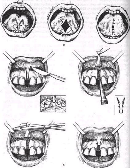Рис 192 Этапы операции при укороченной уздечке языка (а) и низком прикреплении уздечки верхней губы (б) онного аппарата под влиянием привычной неправильной функции языка может наступить рецидив аномалии. Укороченная уздечка языка затрудняет фиксацию съемных протезов. Ограничение подвижности языка может привести к функциональным нарушениям, возникновение которых можно предупредить своевременным и несложным хирургическим вмешательством. Многие авторы (Н. И. Агапов, А. И. Бетель-ман, Г. А. Васильев, А. И. Евдокимов, В. Ю- Курляндский и др.) рекомендуют рассекать укороченную уздечку или отсекать ее от нижней поверхности языка. После рассечения уздечки у детей младшего возраста легче происходит перестройка функции мышц языка; в более старшем возрасте труднее преодолеть укоренившиеся привычки. Рассечь укороченную уздечку языка лучше в первые дни жизни ребенка. После смазывания слизистой оболочки раствором дикаина или внутримышечного введения 1% раствора новокаина уздечку рассекают ножницами или скальпелем в поперечном направлении (рис. 19.2). Иногда для обеспечения большей подвижности языка вторым поперечным разрезом отсекают уздечку от поверхности альвеолярного отростка. Широкие уздечки оперируют путем перемещения встречных треугольных лоскутов по Лимбергу. После рассечения уздечек первого, второго и третьего видов наложения швов у новорожденных не требуется. В более старшем возрасте многие дети после рассечения укороченной уздечки языка не могут самостоятельно поднять его кончик, несмотря на то что механическое препятствие устранено. Это можно объяснить недостаточной тренировкой мышц. Через неделю после операции нужно рекомендовать гимнастические упражнения для мышц, поднимающих кончик языка. Одно из таких упражнений — присасывание кончика языка к небу, а затем быстрое открывание рта и щелканье языком. Пациенту предлагают пересчитать кончиком языка зубы на верхней челюсти, достать языком верхнюю и нижнюю губы, кончик носа. В результате тренировки и занятий с логопедом дети обучаются поднимать язык. Ранняя пластика уздечки языка предупреждает нарушение функций сосания, жевания, глотания, произношения звуков, а также возникновение зубочелюстных аномалий. Ортодонти-ческое лечение таких детей сочетают с лечебной гимнастикой. Нормализация функции мышц языка способствует устойчивости результатов ортодонтического лечения. Пластика уздечки языка в старшем возрасте и у взрослых улучшает его функцию, способствует нормализации положения языка. После множественной потери зубов облегчается замещение дефектов зубных рядов съемными пластиночными или бюгельными протезами. Перемещение уздечки губы. Низкое прикрепление уздечки верхней губы принято считать одной из причин диастемы на верхней челюсти (рис. 19.3). Однако практика показывает, что, несмотря на распространенность этой анатомической особенности, она не всегда сочетается с диастемой. В связи с этим значение низкого прикрепления уздечки верхней губы как основного этиологического фактора диастемы не вполне под-