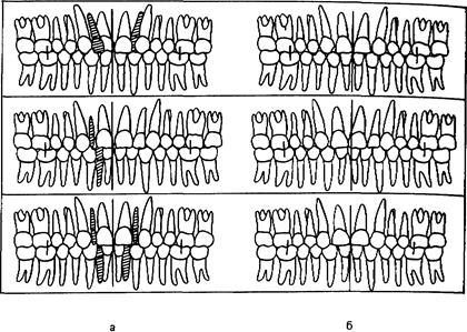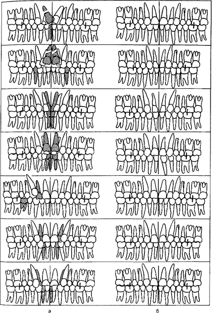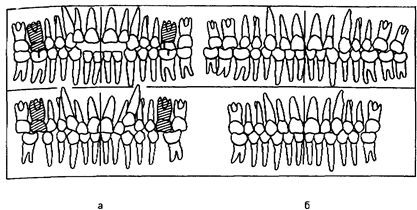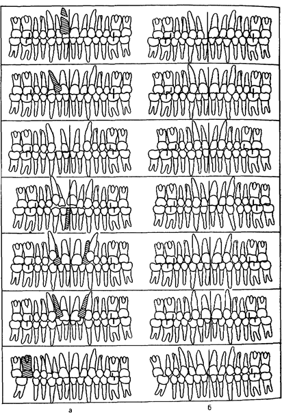 Рис 198 Варианты удаления отдельных зубов (заштрихованы) при неитральном прикусе (а) Результаты лечения (б)