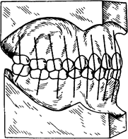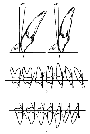 Рис 20 4 III ключ по Эндрюсу — инклинацич зубов' резцов — положительная (1), отрицательная (2), остальных зубов — правильная (3, 4). Ключ [1 — правильная ангуляция (мезиодистальный наклон) в градусах продольных осей коронок всех зубов. Ее характеризует величина угла, образованного при пересечении оси клинической коронки каждого зуба и перпендикуляра к окклюзионной плоскости При оптимальной окклюзии ангуляция бывает положительной тогда, когда окклюзионные сегмент фациальной оси клинической коронки зуба находится мезиаль-нее по отношению к десневому, и отрицательной — при обратном соотношении. Последнее характеризуется как отклонение от нормы (рис. 20.2, 20.3). Ключ III — правильный торк (вестибулооральный наклон коронок и корней) зубов. Его характеризуют величиной угла, образованного при пересечении касательной к фациальной поверхности клинической коронки зуба в ее срединной фациальной точке и перпендикулярном к окклюзионной плоскости. При нормальном расположении коронок резцов их окклюзионная часть находится вестибулярное по отношению кдесневой части. В норме лингвальный наклон окклюзионной части коронок боковых зубов верхнего зубного ряда увеличивается по направлению от клыков к молярам (рис. 20.4). Ключ IV — зубы, расположенные в зубных рядах, не должны быть повернуты по оси. Передние зубы, повернутые по оси, занимают меньше места в зубной дуге, что приводит к ее уплощению и укорочению. Повернутые по оси премоляры и моляры занимают больше места в зубной дуге, что способствует ее деформации и удлинению, а следовательно, нарушению окклюзии (рис. 20.5). Ключ V — наличие плотных точечных контактов между зубами каждого зубного ряда без диастемы и трем. Ключ VI — вогнутость кривой Шпее не должна превышать 2 мм, что определяют при измерении наибольшего расстояния между плоскостью, соприкасающейся с режущими краями центральных резцов нижней челюсти и выступающими дис-тальными буграми последних постоянных моляров, и наиболее низко расположенной окклюзионной поверхностью боковых зубов. Чем короче зубная дуга и длиннее апикальная, тем глубже кривая Шпее, что приводит к неправильной позиции зубов и отклонению их продольных осей (рис. 20.6). Ключ I позволяет определить нарушение смыкания первых постоянных моляров в мезиодистальном направлении с учетом места расположения и контактов вершины мезиально-щечного и дистально-щечного бугров первого постоянного моляра с правой и левой стороны зубных рядов по отношению к межбугровой фиссуре первого постоянного моляра нижней челюсти и ската мезиально-щечного бугра второго моляра. Ангуляцию зубов (ключ II) оценивают по величине угла, образованного фациальной осью клинической коронки каждого зуба и линией, перпендикулярной к окклюзионной плоскости. Ангуляция считается положительной, если окклюзион-ный сегмент фациальной оси клинической коронки находится мезиально по отношению к десневому сегменту, и отрицательной — при обратном соотношении. При оптимальной окклюзии каждый зуб должен иметь характерную для него ангуляцию. Угол торка (ключ III) определяют между перпендикуляром к окклюзионной плоскости и линией, касательной к фациальной оси клинической коронки зуба в ее срединной фациаль-