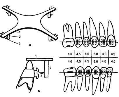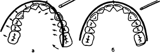 Рис. 20.22. Реверсивные дуги отечественного производства. В начале лечения дуги укрепляют в брекетах на премолярах (а), после улучшения окклюзионной кривой — в брекетах на клыках (6), при завершении лечения — также в брекетах на резцах. пациента к давлению и тяге на зубы их заменяют дугами большего сечения (0, 45 мм).