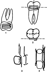 Рис. 20.12. Раздвигание первых постоянных моляров с помощью лигатурных повязок и специальных резиновых прокладок. 1 — этапы ошибочного наложения повязки с мезиальной стороны моляра при прорезывании вторых постоянных моляров; 2, 3 — правильное наложение повязки с дистальнои, а затем с мезиальной стороны; 4 — неправильное придесневое расположение концов лигатурных повязок; 5 — га нтеле видные прокладки. Коронки зубов, принадлежащих к различным функциональным группам верхней и нижней челюстей, имеют разные размеры, форму и кривизну вестибулярной поверхности. В связи с этим брекеты для зубов верхней и нижней челюстей, правой и левой сторон различаются между собой. Произвольный подбор брекета не обеспечивает его прочной фиксации с помощью композитного материала на зубе. Необходимо избрать брекет, предназначенный для определенного зуба соответствующей челюсти и соответствующей стороны зубного рада. В случае острой необходимости брекеты, предназначенные для клыка и премо-ляров верхней челюсти справа, допустимо приклеивать к эмали аналогичных зубов нижней челюсти слева и наоборот, а брекеты, предназначенные для клыков верхней челюсти слева, — на аналогичные зубы нижней челюсти справа и наоборот. Изготовление индивидуальных колец на опорные моляры, припаивание или приваривание к ним замков-трубок или подбор стандартных колец. Стандартные кольца на опорные моляры, выпускаемые фирмой «Кассис», недостаточно эффективны. В связи с этим в клинической практике их изготавливают из индивидуально отштампованных стальных коронок на зубы. Для раздвижения опорных зубов используют сепарационные брон-зоалюминиевые лигатуры диаметром 0, 2 мм, которые устанавливают на 1—2 нед. Ошибки состоят в нарушении последовательности наложения сепарационных лигатур (рис. 20.12). Сначала следует установить лигатуру между зубом, избранным для опоры и позади стоящим, а затем между ним и впереди стоящим. Попытка провести лигатуру с дистальнои стороны зуба, если уже установлена лигатура с мезиальной его стороны, не всегда бывает успешной, особенно в случаях частичного прорезывания коронок вторых постоянных моляров (рис. 20.13). Прокалывание слизистой оболочки при проведении лигатуры между зубами недопустимо, так как при закручивании лигатуры возникают боль, травма и воспалительный процесс. Избежать такого осложнения можно, изогнув полукругом конец лигатуры перед ее проведением между зубами. Скручивать лигатуру следует плоскогубцами или иглодержателем, концы которых устанавливают на расстоянии 7 мм от жевательной поверхности моляров. Излишки проволоки отрезают, отступя 5, 5—6 мм от начала скрученной проволоки, укладывают в продольную борозду жевательной поверхности моляра и прижимают к ней. Не следует располагать скрученный конец с вестибулярной стороны зуба. Такая лигатурная повязка не обеспечивает эффективного раздвижения зубов. На опорные моляры для фиксации концов назубных дуг надевают металлические кольца, к которым припаяны или приварены трубки для фиксации концов назубных дуг. Коронки изготавливают путем штамповки из стандартных металлических гильз. Для ортодонтических целей желательно использовать тонкие гильзы (0, 18 мм). После изготовления коронки, припа-ивания или приваривания трубок и по показаниям крючков с оральной поверхности ко