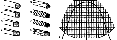 Рис. 20.18. Разновидности ортодон-тической проволоки. 1 — круглая; 2 — квадратная; 3 — прямоугольная; 4 — прямоугольная с закругленными углами; 5—7 — твист-флекс проволока, скрученная из трех (5), шести нитей (6—7); 8 — прямоугольного сечения; 9 — приспособление (по Бооне), облегчающее изгибание симметричной дуги. Рис. 20.19. Компенсационные изгибы на дугах для верхнего и нижнего зубных рядов, выполняемые при лечении стандартной эджуайз-тех-никой. выпускает с маркировкой концов дуги различным цветом — соответственно: красным, черным, зеленым и синим, что удобно для практики. Кроме таких дуг, выпускаются отрезки аналогичной проволоки длиной 180 мм и устройство для формирования стальных ортодонтических дуг. Преформированные дуги, т. е. изогнутые с учетом наиболее типичной нормальной формы зубных дуг, должны быть подобраны с учетом индивидуальных размеров зубов и зубных рядов пациента. Важно следить за совпадением срединной маркиро-вочной точки на дуге со срединной точкой зубного ряда (рис. 20.20). Использование трафаретов назубных дуг, нанесенных на прозрачную жесткую пленку, облегчает подбор стандартной дуги (см. рис. 20.18).