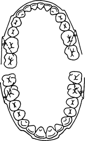 Противопоказания к приклеиванию брекетов к эмали зубов с помощью композитных материалов. Применение бондинг-техни-ки противопоказано при: 1) плохом гигиеническом содержании зубов и полости рта, отсутствии навыков ежедневной добросовестной двукратной чистки зубов — утром и вечером; 2) наличии меловидных пятен на эмали зубов, трещин и кариозных полостей, множественных пломб, в том числе при нетипичной их локализации; 3) пользовании пастой, содержащей фтор, проведении ре-мотерапии за 1 мес до приклеивания брекетов; 4) привычке к употреблению большого количества напитков (кока-колы, пепси-колы), сахара. Прежде чем приступить к выбору конструкции ортодонти-ческого аппарата для устранения зубочелюстно-лицевой аномалии, следует определить резистентность зубов к кариесу и выявить пациентов с повышенным риском его возникновения. С этой целью определяют индекс гигиены и рН налета, скорость слюноотделения, текучесть и кристаллообразовательную способность слюны, а также ее толерантность к глюкозе (глю-котест). Кроме того, определяют кислотную резистентность эмали зуба, используя для этого тест эмалевой резистентности (ТЭР) и CRT-тест (цветовая реакция во времени). При использовании несъемных конструкций ортодонтичес-ких аппаратов особое внимание необходимо уделять навыкам гигиены полости рта и ее качеству. При обучении чистке зубов следует объяснять пациенту значения всех манипуляций и их последовательность: 1) вымыть руки; 2) прополоскать полость рта водой; 3) тщательно промыть зубную щетку проточной водой из-под крана; 4) выдавить зубную пасту на зубную щетку на длину ее головки; 5) чистить зубы каждой половины челюсти в течение 0, 5 мин; 6) прополоскать полость рта водой; 7) промыть зубную щетку, намылить ее и оставить намыленной в стакане головкой кверху. Чистку зубов начинают с верхних правых коренных зубов. Рекомендуется делать по 10 движений щеткой на каждом сегменте зубной дуги: в области моляров, премоляров и передних зубов с их наружной, внутренней и жевательной поверхности,