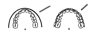 Рис 20 20 Наложение преформированной зубной дуги на зубной ряд а — неправильное (срединная маркировочная точка смешена в сторону), б — правильное