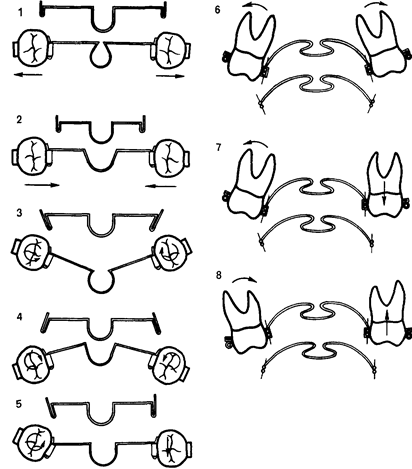 относительно малой силы зуб наклоняется в сторону наименьшего сопротивления. Анкирования опорных зубов можно достигнуть за счет: 1) включения в опору большего количества зубов, имеющих достаточную площадь корней, например вторых постоянных моляров; 2) изгибов на концах дуг между вторыми премолярами и первыми молярами под углом 30° к окклюзионной плоскости, препятствующих смещению опорных зубов.