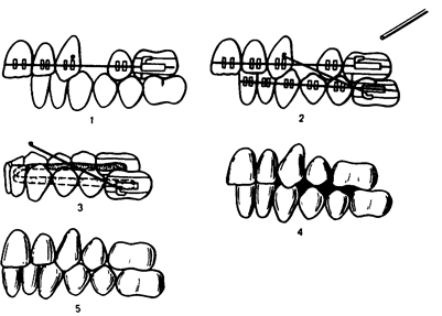 Рис 20 44 Этапы лечения дистального прикуса после удаления 4_L4 зубов. 1 — дистальное перемещение 3 |3 зубов одночелюстной тягой ошибочно, 2 — показана межчелюстная тяга от крючков на брекетах 3 | 3 зубов до крючков на трубках 6 | 6 зубов, 3 — опорная лингвальная дуга с крючками на трубках 6|6 зубов, 4 — нефизиологическое бугровое соотношение зубов, 5 — лечение завершают после достижения бугрово-фиссурных контактов резцовым перекрытием (класс 11^ по Энглу) после удаления первых премоляров на верхней челюсти можно применить нитиноловые дуги и зафиксировать их на зубах верхней и нижней челюстей. Первый этап лечения — дистальное перемещение клыков верхней челюсти на место удаленных первых премоляров с помощью одно- и межчелюстной круглосуточной тяги. Затем следует исправить положение зубов на нижней челюсти в сагиттальном, трансверсальном и вертикальном направлениях. Основная цель лечения — достигнуть нейтрального соотношения клыков верхней и нижней челюстей. Второй этап лечения — анкирование клыков, вторых премоляров и первых постоянных моляров с помощью восьмиобразной металлической лигатурной повязки. Ее укрепляют за крючок на опорном моляре, затем перекрещивают концы проволоки, охватывают лигатурой брекеты вторых премоляров, снова перекрещивают концы и охватывают брекеты клыков, после чего скручивают проволоку. Ее отрезают и оставляют концы длиной 3 мм, которые подгибают к дуге. В процессе лечения