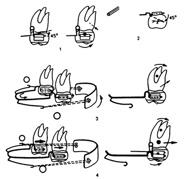 Рис 20 46. Дистальное перемещение опорных моляров. 1 — с помощью пружин, изогнутых на назубной дуге, заканчивающихся стопорами, для предотвращения поворота по оси б |б зубов, 2 — концы дуги изгибают орально под углом 45°, ось вращения 6 I б зубов находится в области их коронок, 3 — с помощью лицевой дуги и внеротовой тяги ось вращения 6 |6 зубов перенесена на область их корней; 4 — с помощью назубной и лицевой дуг ось вращения перенесена на границу средней и нижней частей зуба кам на опорных молярах и отвести дугу от передних зубов. В случае использования одночелюстной дуги для дистального перемещения первых постоянных моляров сила прилагается в области их коронок, что может вызвать изменение расположения опорных зубов — их поворот по оси и вестибулооральное смещение. Для предотвращения этой ошибки концы назубной дуги следует изогнуть орально под углом 45°. Дистальное перемещение первых постоянных моляров с помощью одночелюстной дуги может быть успешным при показаниях к перемещению зубов в пределах 3 мм. Если требуется переместить опорные моляры на большее расстояние, то необходимо применить лицевую дугу с внеротовой тягой и приложить силу ближе к границе средней и верхней трети их корней. В таком случае превалирует дистальное перемещение