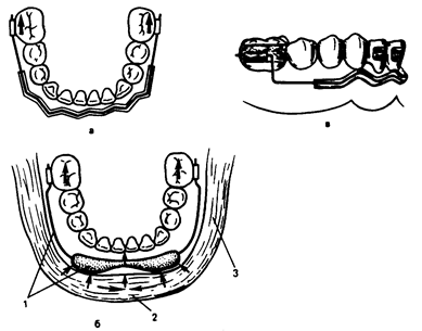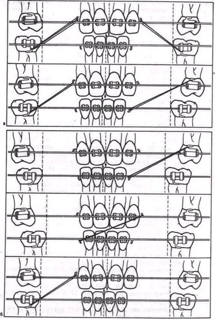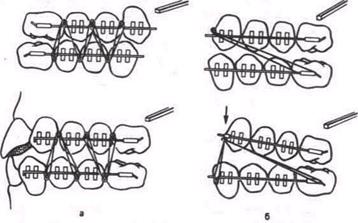 Рис. 20.52. Варианты межчелюстной тяги в боковых участках зубных дуг для устранения глубокого (а) и открытого (б) прикуса.