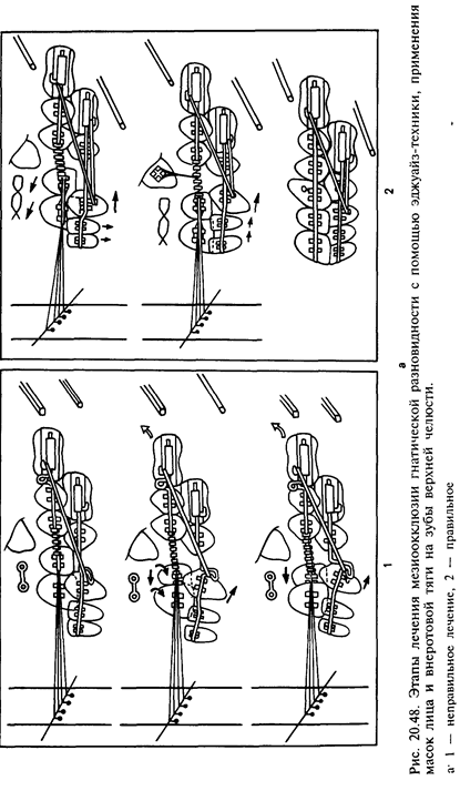 Рис. 20.48. Продолжение. б — разновидности масок лица и внеротовой тяги. Наиболее частые ошибки, допускаемые при лечении мези-ального прикуса, состоят в наложении четырехгранной дуги на верхний зубной ряд с удлиняющими его открытыми пружинами, а также пружинами растяжения между Щ и 4^4, укреплении назубной дуги в брекетах на 21 112 с помощью цепочки аластика; наложении круглой дуги на нижний зубной ряд, применении межчелюстной резиновой тяги от крючков на трубках 6|6 до крючков, изогнутых на дуге в области ЗТЗ, а также внеротовой тяги от 21 | 12 к лицевой маске. В результате такого лечения происходят поворот по оси 21, 112 и их медиальное смещение вследствие недостаточной фиксации с помо-щью аластика и действия раздвигающих зубы пружин; 3 13 наклоняются дистально, между резцами появляются тремы, ухудшается смыкание -^. Ошибочным является укрепление на нижнем зубном ряде вместо круглой дуги четырехгранной без специальных пружин для исправления положения резцов, клыков и моляров. При этом внеротовая тяга не обеспечивает мезиального перемещения 21 112. Лечение мезиального прикуса гнатической разновидности заключается в использовании нитиноловых или круглых эластичных дуг, жестко укрепленных в брекетах резцов верхней челюсти восьмиобразной лигатурной повязкой, применении навитых пружин, раздвигающих 4—2| и |2—4 зубы, а также одночелюстной тяги для дистального перемещения ЗТЗ и межчелюстной тяги от крючков на 6|6 до крючков на брекетах 3 1 3. После раскрытия места в зубной дуге для 3_Ц и удлинения переднего сегмента верхней зубной дуги посредством внеротовой тяги к лицевой маске достигают контактов между резцами обеих челюстей. Затем стягивают зубы нижней челюсти алас- тиком от 61 до Г5^ и используют межчелюстную тягу для обеспечения физиологического прикуса (рис. 20.48). В процессе лечения важно стремиться к мезиальному перемещению резцов верхней челюсти и при показаниях — к увеличению промежутка в зубной дуге для неправильно расположенных верхних клыков. С этой целью раздвигающие зубы навитые пружины устанавливают между брекетами боковых резцов и первых премоляров на дуге верхнего зубного ряда. При таком варианте лечения необходимо пользоваться одночелюстной тягой для дистального перемещения клыков нижней челюсти и межчелюстной резиновой тягой от крючков на опорных молярах верхней челюсти до крючков на брекетах клыков нижней челюсти. Для равномерного мезиального перемещения резцов верхней челюсти и предотвращения тесного расположения передних зубов их следует прочно зафиксировать металлическими лигатурами, а также наложить лигатуры на премоляры верхней челюсти. Если пациент пользуется межчелюстной тягой нерегулярно, т. е. не круглосуточно, не выполняет наставлений врача, то смыкание моляров может ухудшиться. После устранения сагиттальной щели между резцами и при наличии глубокого или умеренного обратного резцового перекрытия желательно временно применить пластинку для нижней челюсти с наклонной плоскостью для резцов верхней челюсти, что значительно облегчит вестибулярное перемещение резцов. Необходимо продолжать пользоваться одно- и межчелюстной резиновой тягой. Затем нитиноловые дуги заменяют четырехгранными для уточнения торка и ангуляции зубов, что помогает успешно завершить ортодонтическое лечение. Экзо- и эвдоокк