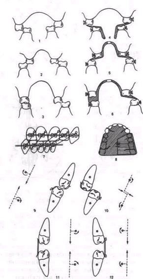 Рис. 20.53. Варианты межчелюстной тяги в переднем участке зубных дуг для устранения открытого прикуса. лярному укорочению в области передних зубов, если в зубном ряду не создано достаточно места для каждого зуба. При их тесном расположении не показано ступенеобразное изгибание четырехгранной назубной дуги (рис. 20.54). Стремление к внедрению передних зубов способствует нарушению обменных процессов в тканях пародонта. В таком случае следует по ор- тодонтическим показаниям удалить на нижней челюсти первые