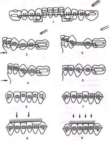 Рис. 20.54. Устранение супраокклюзии резцов нижней челюсти. 1 — с помощью четырехгранной дуги с пружинами; 2 — ошибочное применение ступенеобразной четырехгранной дуги при укороченном апикальном базисе нижней зубной дуги, тесном положении резцов; 3 — после удаления 4Г4 зубов — дистальнос перемещение ТГз зубов; 4, 5 — выравнивание кривой Шпве; 6, 7 — неправильный уровень расположения брекетов приводит к аномальному расположению режущих краев резцов; 8 — ошибочное применение пластинки с накусочнои площадкой для их внедрения; 9 — пластинка показана после достижения единого уровня расположения резцов. премоляры, дистально переместить клыки, создать место в зубной дуге для резцов и лишь после этого с помощью круглой нитиноловой дуги и одночелюстной тяги достигнуть нормализации кривой Шпее. В процессе дистального перемещения клыков можно по показаниям использовать межчелюстную резиновую тягу. Неправильное расположение брекетов на зубах в вертикальном направлении в процессе ортодонтического леченияприводит к нарушениюуровня расположения режущих краев переднихзубов. Ошибочным является стремление установить эти зубы в правильном положении путем одновременного применения пластинки дляверхней челюсти с накусочной площадкой, чтоможет привести к травматическому периодонтиту, а такжерассасыванию костной ткани в области резцов в результатеих перегрузки. Чтобы предотвратить неблагоприятные последствия, нужно ' снять неправильно расположенные брекеты и приклеить их в правильном положении.После выравнивания положения передних зубов нитиноловой дугойможно использовать пластинку для верхней челюсти с накусочной площадкой для резцов нижней челюсти имежчелюстную тягу для выравнивания кривойШпее.