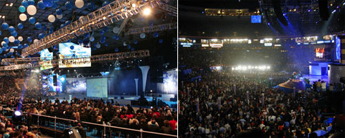 Виктор Янукович появился на сцене из синего тумана, под пафосную музыку и красочное освещение. Трибуна, на которой расположились тысячи делегатов из разных регионов страны, встретила лидера волной голубых флажков. Грандиозное шоу было рассчитано на то, чтобы продемонстрировать сплоченность Партии регионов. И в большей степени эта демонстрация была направлена не столько на внешних наблюдателей, сколько на самих делегатов. Выступления первой десятки закончились тоже по-американски – дождем бело-голубого блестящего конфетти. Примерно также закончился последний съезд Республиканской партии США в Бостоне.