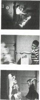 Рис. 7.8. Научение путем наблюдения. Понаблюдав за моделью-человеком, «избивающим» резиновую куклу {вверху), маленький мальчик (в середине) или девочка (внизу) в соответствующей ситуации воспроизводят это