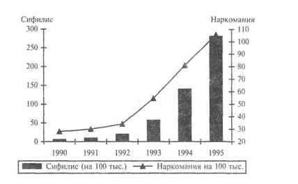 Рис. 8.1. Заболеваемость подростков сифилисом и распространение наркомании Социальное обеспечение и социальная помощь. В демократическом обществе каждый человек имеет социальные гарантии, представляющие собой совокупность материальных и юридических средств, обеспечивающих реализацию конституционных социально-экономических и социально-политических прав членов данного общества (право на труд, образование, медицинскую помощь и т.д.). Один из элементов социальных гарантий — социальное обеспечение, то есть система мероприятий по материальному обеспечению граждан в старости, в случае болезни, при полной или частичной утрате трудоспособности, при потере кормильца. К мероприятиям по социальному обеспечению относятся также: выдача пособий на детей в малообеспеченных семьях; содержание инвалидов войны и труда в домах инвалидов; содержание одиноких и престарелых людей в домах-интернатах; содержание детей-инвалидов в специальных детских домах; бесплатное и 50%-ное предоставление лекарств и др. Основными видами социального обеспечения являются пенсии и разного рода пособия. По данным Министерства труда и социального развития в 1996 году на учете в органах социальной защиты состояло более 7 млн инвалидов (табл. 8.4). Оценка населением своей личной безопасности и проблемы преступности. Проблемы личной безопасности всегда и везде занимали важное место при оценке населением качества жизни. Безопасность рассматривает ся как ситуация, при которой человеку ничто и никто не угрожает, не может принести вреда. Особую остроту проблемы безопасности приобретают в периоды социальной нестабильности, сопровождающейся ростом преступности, алкоголизма, наркомании. Таблица 8.4 Численность инвалидов, состоящих на учете в органах социальной защиты населения (тыс. человек) России (на конец года)
