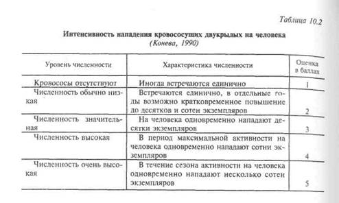 Неблагоприятные последствия для здоровья, а также экономический и психологический ущерб от нападения клещей, особенно в районах пионерного освоения, могут быть очень велики, так как клещевой энцефалит, например, приводит к стойкой потере трудоспособности и даже к смертельному исходу. Наиболее приемлемым для ранжирования территории по уровню опасности заражения людей клещевым энцефалитом служит напряженность или интенсивность циркуляции возбудителя этого заболевания между хранителями и переносчиками в природном очаге. Например, на карте «Клещевой энцефалит» (1974) напряженность циркуляции возбудителя клещевого энцефалита оценивается следующим образом (табл. 10.4):