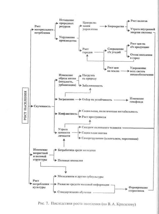 Рост потребления. Рост населения не пропорционален росту потребления, так как обычно сопровождается падением уровня жизни. Потребление возрастает прежде всего за счет тех областей, которые мало связаны с уровнем жизни (например, потребление зерна, риса и т.п.). Рост городов. В силу того что сельскохозяйственное производство не предоставляет дополнительных рабочих мест, избыточное население сосредоточивается в городах. Рост городов происходит нередко за счет сельскохозяйственных угодий, что, в свою очередь, ведет к усилению оттока населения из сел в города. Загрязнение среды возрастает из-за увеличения объема бытовых отходов, роста городов как наиболее мощных источников загрязнения, интенсификации сельскохозяйственного производства. Загрязнение провоцирует рост заболеваемости, запуская механизм естественного отбора, ведущего к изменению (ухудшению) генофонда. Борьба с загрязнением, в свою очередь, сопряжена со значительным увеличением непроизводительных расходов. Падение уровня жизни. Основные факторы падения уровня жизни связаны с ростом численности населения - многодетностью и обусловленным ею дефицитом семейного бюджета, ростом цен на землю, соответствующим удорожанием жилищного строительства, ресурсов, всех систем жизнеобеспечения, а также с ростом непроизводительных расходов. Изменение структуры населения. Сдвиг в пользу городского населения с ростом его численности сопровождается: -изменением соотношения возрастных групп: омоложением населения, сопровождаемым ростом безработицы среди молодежи, преступности и общей социальной нестабильности; - изменением соотношения полов в младших возрастных группах: число мальчиков превышает число девочек; - изменением соотношения полов в старших возрастных группах: снижением продолжительности жизни мужчин по сравнению с женщинами; увеличением числа одиноких женщин среднего и пожилого возрастов. Скученность. Скученность населения ускоряет процесс загрязнения среды. Она провоцирует гормональные нарушения у человека, увеличивает степень конфликтности и агрессивности в семье и на производстве. Социально-психологические последствия скученности - отчуждение, утрата социальной значимости личности, снижение ценности жизни, социальное безразличие и карьеризм (стремление обрести значимость любой ценой), саморазрушение (алкоголизм, наркомания, половые извращения, исключающие из репродуктивного процесса), преступность. Более детально последствия роста численности населения проиллюстрированы на рис. 7. Демографическая емкость нашей планеты большинством экологов оценивается в 1, 0-1, 5 млрд человек (при идеальных общественно-экологических условиях). Фактическое ее население в конце XX в. вплотную приблизилось к рубежу в 6 млрд человек (по последним данным осенью 1999 г. этот рубеж был преодолен). Сегодня Земля, по оценкам специалистов, перенаселена не менее чем в 3 раза. Однако рост населения, как отмечает П. Агесс, по-видимому,