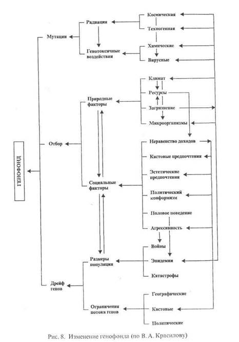 ческое разнообразие предопределило многообразие и динамичность развития человеческой культуры. Высшее достижение этой культуры - гуманистический принцип равноценности всех людей -в переводе на биологический язык означает сохранение генофонда, не подлежащего искусственному отбору Вместе с тем продолжается действие и естественных факторов изменения генофонда - мутации, дрейф генов и естественный отбор. Загрязнение среды влияет на каждый из них. Хотя эти факторы действуют совместно, в аналитических целях имеет смысл рассмотреть их по отдельности. Факторы мутагенеза. К ним из физических воздействий кроме ионизирующего излучения, возможно, относятся электромагнитные поля. Установлено, например, повышение заболеваемости лейкемией у лиц, проживающих длительное время вблизи высоковольтных линий электропередачи. Из сотен тысяч разнообразных химических соединений, поступающих в среду в виде бытовых и производственных загрязнений, около 20%генотоксичны. Мутационные изменения снижают жизнеспособность организма в 1-2-кратном соотношении со скоростью гаметного мутагенеза. Наряду с прямым канцерогенным эффектом - мутациями, нарушающими взаимодействие клеточных клонов в процессе их роста и трансформации, происходит нарушение контрольных функций гормональной и иммунной систем, на фоне которого возрастает риск злокачественных новообразований как хемотоксичной, так и вирусной этиологии. Мутагенез, сопровождающий встраивание вирусной частицы в клеточный геном, также может возрастать вследствие иммунной недостаточности организма, появления новых штаммов вирусов или того и другого. Дрейф генов. В прошлом дрейф генов был связан с резкими колебаниями численности локальных популяций, истребляемых войнами и эпидемиями. Выжившие основатели новой популяции передавали ей черты своей генетической индивидуальности. Утраченная часть генетического разнообразия восстанавливалась за счет повторных мутаций и потока генов, но определенные отличия могли сохраняться длительное время. Сегодня рост численности и более подвижный образ жизни предохраняют генофонд от дрейфа генов, разве что за исключением малочисленных популяций на океанических островах, в горных районах или тропических лесах. Естественный отбор. Внимание общественности и экспертов в первую очередь привлекают генотоксичные факторы прямого действия и связанные с ними заболевания, тогда как естественный отбор - в долгосрочном плане гораздо более мощный фактор изменения генофонда - остается в тени. Между тем любое воздействие на среду хотя бы в небольшой степени изменяет направлен- но ность отбора, создавая давление на популяцию и сдвигая частоты соответствующих генотипов. Ген может долго удерживаться в популяции, несмотря на негативный отбор (который недостаточно эффективен при низких частотах), но угроза обеднения генофонда со временем становится все более реальной. Охрана среды обитания и системы здравоохранения - факторы, по существу, противостоящие естественному отбору в человеческих популяциях. Тем не менее отбор действует в особенности на пренатальном уровне (например, в виде ранних самопроизвольных абортов, которые могут остаться незамеченными). Любое заболевание снижает шансы на успешную карьеру, создание семьи и полноценный генетический вклад в с