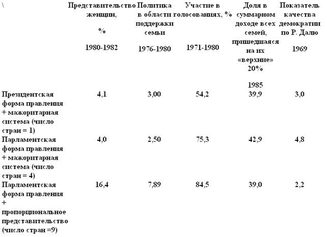 П р и м е ч а н и е. Единственная страна, сочетающая президентскую форму правления с мажоритарной системой, — Соединенные Штаты; четыре страны с парламентской формой правления и мажоритарной системой — Австралия, Канада, Новая Зеландия и Соединенное Королевство; девять стран, сочетающие парламентскую форму правления и пропорциональное представительство, — Австрия, Бельгия, Дания, Финляндия, Германия, Италия, Нидерланды, Норвегия и Швеция. Происходит ли с увеличением представительства женщин более успешное продвижение их интересов? Произведенное Хэролдом Л. Ви-ленским тщательное ранжирование демократий по степени инновационности и масштабности их политики в области поддержки семьи — а это для женщин дело особой важности — указывает на существование такой зависимости1. На шкале, градуированной тринадцатью точками (от максимально возможного показателя, равного 12, до минимального — нулевого), показатели для этих стран расположились между точками «11» и «1». Расхождения между [усредненными] показателями для каждой из трех групп стран (как это продемонстрировано во втором столбце табл. I) поразительны: для группы стран, где действует пропорциональная система представительства, показатель выражается цифрой 7, 89, тогда как для группы стран с парламентской формой правления и мажоритарной системой он составляет 2, 50, а для США — лишь немногим более, т.е. 3, 00. Наивысших уровней здесь достигают опять-таки северные страны, однако и для остальных стран из группы тех, где действуют пропорциональные системы представительства, средний показатель, равный 6, 80, все-таки значительно выше, чем в странах с мажоритарными системами. Последние три колонки табл. 1 содержат показатели качества демократии. В третьей колонке можно видеть надежнейшие данные об участии избирателей в голосованиях (в 70-е гг.); страны, где участие в голосовании обязательно (Австрия, Бельгия и Италия), не учитывались при исчислении средних показателей. По сравнению с чрезвычайно низким уровнем участия — 54, 2%, — наблюдаемым в Соединенных Штатах, страны с парламентской формой правления и мажоритарными системами выглядят гораздо лучше (в среднем примерно 75%). Но еще лучше — несколько более 84% — средний показатель для стран с парламентской формой правления и пропорциональным представительством. Цифры 75 и 84% говорят о различии весьма разительном, если учесть, что реально достижимый максимальный показатель составляет около 90% (как о том свидетельствует уровень активности избирателей в странах, где участие в голосовании обязательно). ____________________ 1 Рейтинги Виленского исчисляются по шкале, градуированной пятью точками (от максимального, обозначаемого цифрой «4», до минимального — нулевого) «для каждого из трех суммарных показателей политики в следующих областях: предоставление отпусков по беременности и родам и по уходу за ребенком — оплачиваемого, а также неоплачиваемого, — и их продолжительность; наличие и доступность развертываемой в рамках государственных программ сети детских дошкольных учреждений, а также усилия правительств по расширению такой сети; и, наконец, гибкость систем, регулирующих порядок оставления работы. Этими показателями измеряется активность правительств в проявлении заботы о детях и в расширении для каждого возможностей выбора в деле согласова