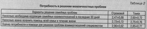 Выявленные показатели характеризуют представленность проблемы, но не отражают ее глубину. Для решения этой задачи была проведена оценка значимости этой проблемы для пациентов. Было выявлено, что во всех группах и в г. Стрежевом и в г. Томске пациенты заявляют о высокой степени значимости поддержания взаимоотношений, желании получить помощь в урегулировании семейных отношений. Это же подтверждается высокими рейтинговыми оценками, данными по этому вопросу специалистом. Достоверных различий в степени выраженности этих проблем в различных группах выявлено не было (табл. 2).