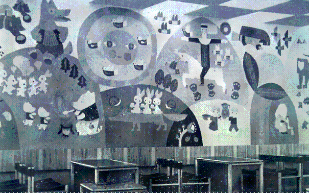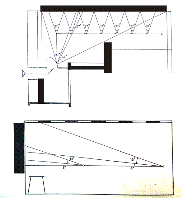 Рисунок 8 тить всю панораму стены. Поле отчетливой видимости составляет 37— 38°, и поэтому приходится обозревать роспись стены постепенно, передвигаясь по проходу параллельно стене (рис. 9). Площадь отдельных секторов, как показывает схема, приблизительно соответствует площади отчетливой видимости для зрителя, передвигающегося вдоль зала и в этом отношении принцип распределения росписи на секторы следует считать оправданным. Но, с другой стороны, посетители (особенно дети) всю высоту стены могут удобно видеть лишь при входе в зал (13°—6°), так как роспись по горизонтали сужается в перспективе. Детям при движении по проходу на высоте нормального горизонтального взгляда и даже выше его на 6° видна лишь нижняя часть росписи стены, т. е. ряд нижних секторов. Чтобы осмотреть верхний ряд секторов, необходимо остановиться и поднять взгляд еще не менее чем на 15°, что уже не так легко. Посетители, сидящие за столиками, расположенными близко к стене, могут увидеть лишь фрагмент росписи (ближайшую ее часть). Форма зала и расположение столиков не соответствуют оптимальным условиям видимости большого по размерам произведения искусства, эмоциональное воздействие которого на посетителей при этом в значительной степени снижается. Учитывая, что зал узкий и сильно вытянут, произведение искусства должно было бы создать иллюзию большого пространства, зрительно «расширить» помещение, по возможности «исправить» пропорции, определившиеся ввиду реконструкции здания. Однако роспись (сама по себе высокохудожественная) имеет четко выделяемые контуры и яркие цветные пятна, что оптически приближает ее к зрителю и вместо того, чтобы зрительно отдалить стену и расширить зал, еще больше сужает его и ухудшает пропорции.
