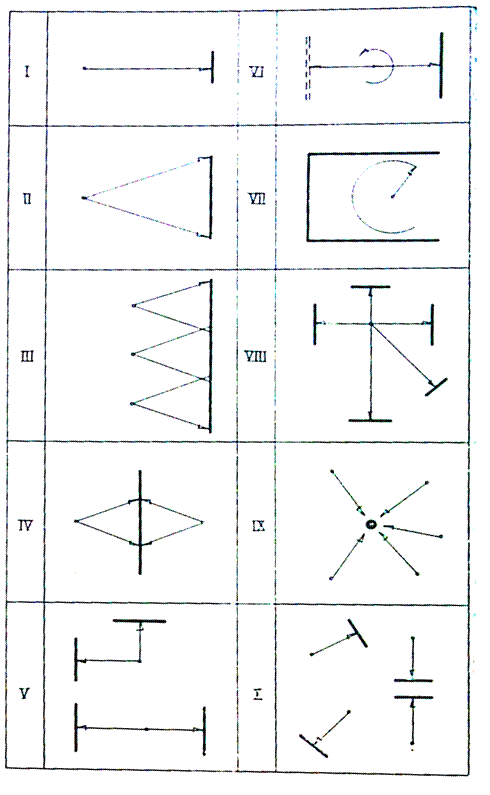 На лестничных площадках произведения монументально-декоративного искусства чаще всего размещают на фронтальной стене. Однако обозревать их обычно мешают лестницы, перила, площадки. В столовой города Утена в Литве выполненное на стене лестничной клетки произведение искусства (тематическое сграффито) при движении посетителей вверх по лестнице вообще оказывается вне пределов оптимального угла видимости, не оказывает на людей эмоционального воздействия, не соответствует своему функциональному назначению, идея которого должна состоять в том, чтобы заинтересовать, приветствовать, приглашать посетителя. При обратном пути условия видимости улучшаются главным образом потому, что не мешают конструктивные элементы. Этот вопрос решается легче и проще, когда для оформления лестничной клетки используется бессюжетное, декоративное произведение искусства, как, например, в интерьере нового здания столовой и ресторана в городе Укмерге. Исходя из опыта, можно сделать вывод, что чем шире марши в двух-маршевых лестницах, тем относительно лучше условия видимости произведения монументально-декоративного искусства, расположенного на фронтальной лестничной площадке, если контур его не поднят от уровня промежуточной площадки. Однако даже при широких маршах оптимальные условия видимости со стороны главного направления — под-лестнице на уровне первого этажа — не могут быть достигнуты, так как этому всегда мешают марши, перила и перекрытия, что особенно неблагоприятно отражается на сюжетных композициях. В этом отношении лучше одномаршевые и трехмаршевые лестницы. Как показывают результаты исследований, варианты формата и размещения произведений монументально-декоративного искусства можно свести к десяти принципиальным схемам (рис. 12):