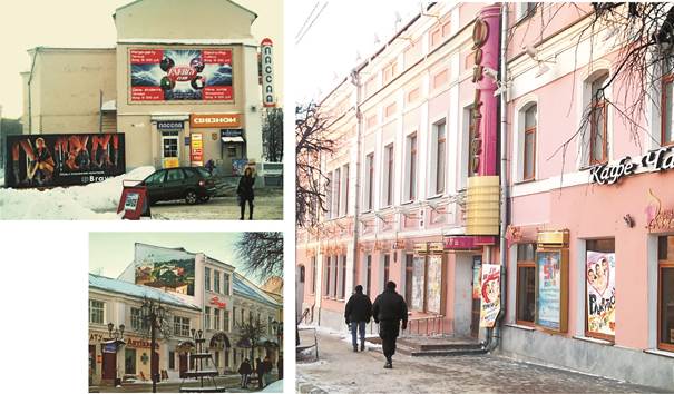 Рисунок 19 Витебск, 2011 г. Примеры наружной рекламы, “разрушающие” архитектуру зданий.
