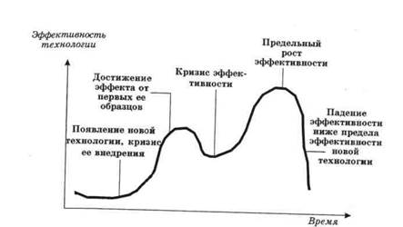 Как видно из рис. 4, жизненный путь новой социальной технологии довольно часто складывается не столь блестяще как хотелось бы ее " родителям" – ученым и социальным технологам. Для ее внедрения зачастую нужны значительные материальные затраты, так как сам механизм внедрения еще до конца не отработан. Поэтому в первый период после внедрения новой технологии наблюдается так называемый " кризис внедрения", характеризующийся спадом ее эффективности, уровень которой иногда бывает даже ниже уровня эффективности прежней технологии. Затем, по мере совершенствования и накопления опыта реализации новой технологии, наблюдается рост ее эффективности. Через некоторое время обнаруживается, что потенциал новой технологии еще не реализован. Разработчики и практики начинают совершенствовать технологию и доводят это совершенствование до такого предела, который в принципе нельзя преодолеть, опираясь на старую технологическую парадигму. Происходит смена технологических парадигм, обнаруживающая появление качественно новых технологий и усиливающая кризис прежних технологий, которые на определенном среднем уровне эффективности сходят с арены. И все опять начинается сначала. Так и продолжается технологический круговорот в человеческом обществе.