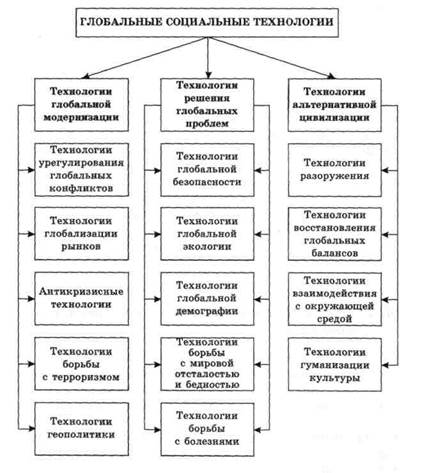 Глобальные социальные технологии ориентированы в основном на решение глобальных общечеловеческих проблем. По сути, они относятся к классу так называемых гипотетических технологий, которые, с одной стороны, неизбежно должны, а с другой – могут проявить себя в будущем. Значительная часть этих технологий уже практически воплощается в социальной деятельности людей, а другая их часть еще находится за пределами не только конструирования, но и осознания их важности и необходимости. Проектирование глобальных социальных технологий представляет собой некую " спасительную магистраль" выхода человечества из постоянно усугубляющегося глобального кризиса и приближающего апокалипсиса. Что касается классификации глобальных социальных технологий, то в социальных науках принято разделять их на три группы (рис. 6). Первую группу составляют технологии глобальной модернизации, реализация которых приводит страны и народы к интеграции во имя формирования единого мирового сообщества. Однако их использование может нередко приносить и вред человечеству, усложняя тем самым глобальные проблемы. Несмотря на это, такие технологии весьма прогрессивны, поскольку интегрируют мировое человечество как субъекта своей деятельности и своей судьбы, способного совместно реализовывать две другие группы глобальных технологий. Вторую группу составляют технологии решения глобальных проблем, которые ориентированы на сдерживание и стабилизацию этих проблем и последующее их разрешение в будущем. Задача этой группы технологий заключается, прежде всего, в том, чтобы взять глобальные проблемы под свой контроль, создать регуляторы и противовесы, обеспечить на первых этапах запас исторического времени для мобилизации всех ресурсов человечества, а на последующих этапах – разрешить эти проблемы и снять их с повестки дня планетарной цивилизации. Понимание сущности этого типа глобальных проблем претерпело несколько этапов. Если в 70-х годах XX ст. люди осознали специфику взаимоотношений между обществом и природой в условиях научно-технической революции, а в 80-х годах была выработана тактика смягчения социально-экологической ситуации и " тушения" острых " экологических пожаров" локального и регионального масштабов, то в 90-х годах человечество для своего экологического выживания должно было разработать единую глобальную стратегию общемирового развития, обеспечивающую необходимое качество окружающей среды для дальнейшего развития человеческой цивилизации в XXI в., а также приступить к ее активной реализации. Третью группу составляют технологии альтернативной цивилизации, которые ориентированы на кардинальное преобразование всех аспектов человеческой жизнедеятельности в целях обеспечения разумного взаимодействия людей с природой, формирования экологического, демографического, ресурсно-сырьевого и других балансов, а также гуманизации культуры и всех сфер жизнедеятельности современного человека. Эти глобальные технологии, как правило, носят ярко выраженный гипотетический характер и призваны закреплять завоевания человечества в борьбе с глобальными проблемами.