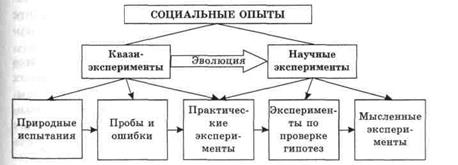 Из рис. 39 видно, что социальный эксперимент входит наряду с квазиэкспериментом в большое семейство социальных опытов. Между тем, его становление происходило постепенно: вначале человеку приходилось вырабатывать варианты своего поведения под воздействием естественных природных испытаний, а затем эволюция заложила в человеческие сообщества пробы и ошибки, которые постепенно переросли в практичес На современном этапе общественного развития технологии социального эксперимента базируются на разработке определенной гипотетической модели рассматриваемого социального явления (или процесса). В нем выявляют основные взаимозависимые параметры и их связи с другими явлениями (процессами). На основе этой модели изучаемое явление (процесс) описывают как систему переменных, среди которых выделяют независимую переменную (экспериментальный фактор), управляемую экспериментатором, которая является гипотетической причиной определенных изменений в зависимой переменной. Неэкспериментальными переменными являются свойства и отношения, имеющие существенное значение для изучаемого явления (процесса), но так как их влияние в этом эксперименте не исследуют, оно должно быть нейтрализовано (или поддержано постоянным). Экспериментальное доказательство объяснительных гипотез основано, как правило, на логических схемах, разработанных еще в 1843 г. известным английским социологом Дж. Миллем. В социальных науках наиболее часто применяют метод единственного различения, состоящий в сравнении двух сложных явлений, отличающихся лишь тем, что в первом случае есть некоторая гипотетическая причина, а в другом ее нет. Гипотезу, таким образом, считают доказанной, если в первой системе доказательства вследствие воздействия экспериментального фактора наблюдается определенное изменение, которого во второй системе доказательства нет [25, с. 630-631]. Между тем, даже сам Дж. Милль, а также О. Конт, Э. Дюркгейм, М. Вебер и другие видные социологи фактически отрицали возможность применения экспериментального метода в изучении социальных явлений, считая последние слишком сложными и изменчивыми для выявления четких причинных зависимостей. Поэтому эксперимент как метод эмпирического исследования применялся до 20-х годов XX в. лишь при изучении природных и искусственных объектов. И только начиная со второй половины XX в. расширилось применение эксперимента в социальных науках при исследовании различных социальных объектов, явлений и процессов в результате того, что для социального эксперимента, как оказалось, характерны следующие весьма важные признаки: 1) возможность предметно-практического преобразования социальных объектов посредством построенного в соответствии с экспериментальной гипотезой импульса; 2) возможность преобразования социального объекта в сравнительно малых масштабах. Ведь эксперимент имеет смысл тогда, когда можно перенести полученные результаты на идентичные социальные объекты или объекты значительно больших масштабов; 3) возможность создания контролируемых и управляемых условий, при которых можно замерять, оценивать и контролировать результаты эксперимента; 4) возможность контроля негативных остаточных деформаций социального объекта как результата воздействия гипотетического импульса. Эксперимент проводят, как правило, при
