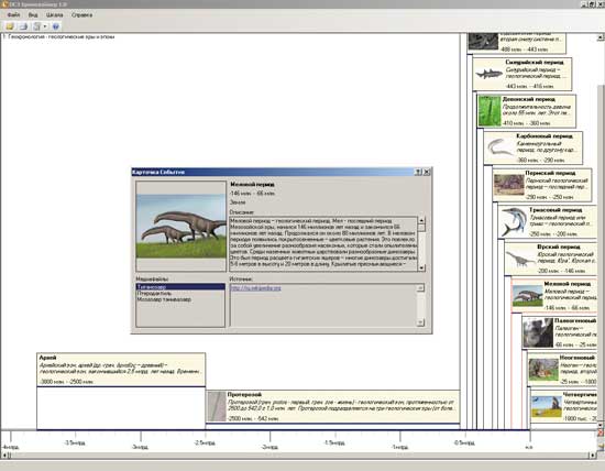 Рис. 16. «Компактный» режим в «ОСЗ ХроноЛайнер» Особенность программы состоит в том, что она предоставляет учителю возможность создавать собственные файлы контентного наполнения ленты времени. Ряд тем уже предлагается в единой коллекции, включая те, что перечислены в таблице. Ресурс предлагает темы не только по истории, но и по другим предметам. Например, на рис. 17 показана лента времени «Геохронология — геологические эры и эпохи», которая способствует формированию у учащихся представления об основных геологических периодах в истории Земли — от архея до кайнозоя. Материал включает описание наиболее значимых для развития биосферы Земли явлений природы и геологических процессов, а также изображения типичных представителей флоры и фауны различных периодов. Данный материал изучается на уроках физической географии.