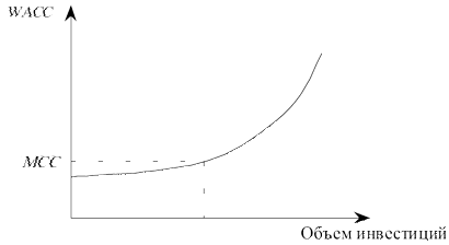 На финансовом рынке цена отдельных источников финансирования постоянно изменяется, следовательно, будет изменяться их соотношение в структуре пассивов предприятия, а также цена капитала (WACC). Поэтому для оценки приемлемости финансовых ресурсов для инвестиций важно определить не только существующую цену капитала, но и цену привлечения каждой дополнительной его единицы, т. е. определить предельную цену капитала. В экономике предельная цена любого изделия ¾ это цена следующей единицы этого изделия. Предельная цена капитала (МСС) ¾ это цена добавленного следующего одного рубля нового капитала. Она рассчитывается на основе прогнозных значений расходов, которые компания вынуждена будет понести для воспроизводства требуемой структуры капитала при сложившихся условиях финансового рынка. При реализации инвестиционных проектов организация, прежде всего, будет использовать нераспределенную прибыль, так как в российских условиях это самый дешевый источник финансирования. Однако он ограничен в объеме, поэтому организация будет вынуждена использовать заемные средства. Это приведет к изменению структуры капитала и повышению риска кредиторов. В результате цена заемных средств с определенного момента начнет расти. Этот момент будет определяться представлениями кредитора о состоянии платежеспособности организации. Таким образом, в течение некоторого периода времени цена капитала будет оставаться постоянной даже при наращивании заемных средств, однако, при достижении некоторого критического объема привлекаемых ресурсов, существенно изменяющего уровень платежеспособности организации-заемщика, WACC, как правило, резко возрастает. Этот процесс графически можно представить следующим образом (см. рис. 6.3).