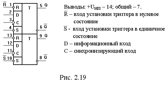 Соответствие выводов одного D-триггера микросхемы К155ТМ2 светодиодам испытательного стенда показано на рисунке 2.18, а условное обозначение микросхемы – на рисунке 2.19.