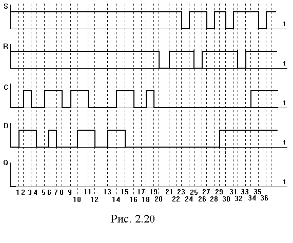 Задания: 1. Вставить печатную плату с микросхемой К155ТМ2 в разъем испытательного стенда. 2. Подключить испытательный стенд к источнику постоянного напряжения 5 В с соблюдением полярности (провод в изоляции красного цвета подсоединяют к выводу " +" источника). 3. Составить временную диаграмму работы одного из 4-х D-триггеров микросхемы К155ТМ2 (рис. 2.20). Дать ответ на вопрос, в какой момент времени (по фронту, во время действия или по спаду синхронизирующего импульса) происходит передача информации с информационного входа на выход. 4. Объяснить принцип работы D-триггера микросхемы К155ТМ2 по функциональной схеме, приведенной на рисунке 2.21.