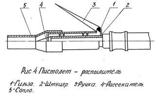Огнетушители порошковые унифицированные ОПУ-5 и ОПУ-10 предназначенные для применения на объектах народного хозяйства, в том числе и на железнодорожном транспорте, в качестве первичных средств тушения пожаров классов А (твердых веществ), В (жидких веществ), С (газообразных веществ) и электроустановок, находящихся под напряжением 1000В (в зависимости от применяемого огнетушительного порошка). Огнетушители предназначены для тушения загораний щелочных и щелочно-земельных металлов и других материалов, горение которых может проходить без доступа воздуха. Огнетушители являются изделиями многоразового использования. Огнетушитель рис.3 состоит из корпуса 1, наполненного огнетушащим порошком. На горловине корпуса посредством накидной гайки 2 закреплена головка 3. На головке установлены баллон 4 (источник рабочего газа), сифонная 5 и газоотводящая трубки 6, рукоятка запуска 7, связанная с иглой 8. Огнетушитель оснащен гибким рукавом 9, пистолетом-распылителем 10, состоящим из гильзы 1 рис.4, подвижного подпружиненного штуцера 2, ручки 3, рассекателя 4 и сопла 5. Принцип действия огнетушителя основан на использовании энергии сжатого газа для аэрирования и выброса огнетушащего порошка.