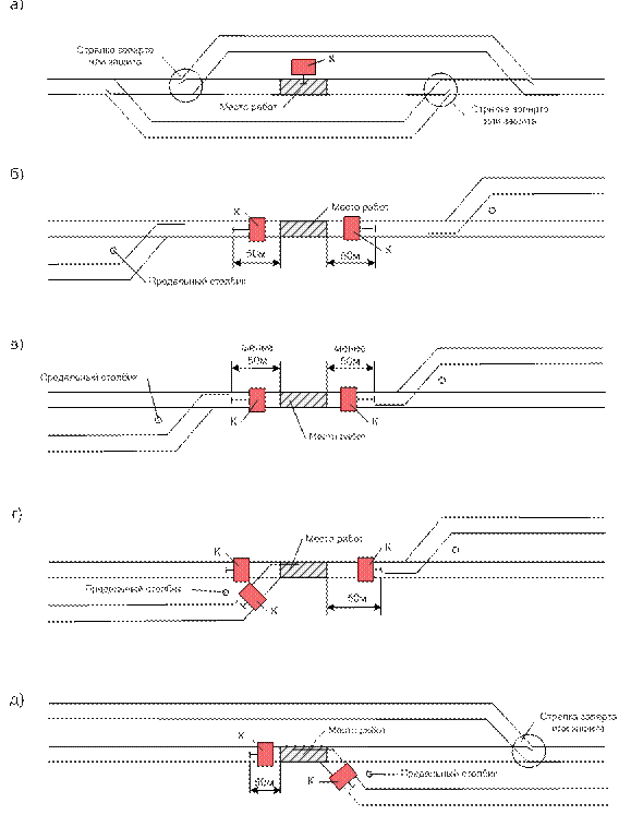 6. ПОРЯДОК ОГРАЖДЕНИЯ МЕСТ ПРОИЗВОДСТВА РАБОТ НА СТАНЦИЯХ 6.1. Всякое препятствие для движения поездов по станционным путям и стрелочным переводам должно быть ограждено сигналами остановки независимо от того, ожидается поезд (маневровый состав) или нет. На станционных путях при необходимости ограждения места производства путевых работ сигналами остановки путь для движения поездов закрывается, все ведущие к этому месту стрелочные переводы устанавливаются в такое положение, чтобы на него не мог попасть подвижной состав. Стрелочные переводы в таком положении запираются на замок или закрепляются порядком, предусмотренным в приложениях 14 и 16. На месте производства работ по оси пути устанавливается переносной красный сигнал (рисунок 6. 1, а). Если какие-либо из этих стрелочных переводов направлены остряками в сторону места работ и не имеют возможности изолировать путь, то такое место с обеих сторон ограждается переносными красными сигналами, устанавливаемыми на расстоянии 50 м от границ участка работ (рисунок 6.1, б). В том случае, когда остряки стрелочных переводов расположены ближе 50 м от места производства работ, между остряками каждого такого стрелочного перевода устанавливается переносной красный сигнал (рисунок 6.1, в). При ограждении места производства работ на стрелочном переводе переносные красные сигналы устанавливаются: со стороны крестовины – против предельного столбика на оси каждого из сходящихся путей, с противоположной стороны – в 50 м от остряка стрелки (рисунок 6.1, г). Если вблизи от стрелочного перевода, подлежащего ограждению, расположена другая стрелка, которую можно поставить в такое положение, что на стрелочный перевод, где выполняются работы или имеется препятствие, не может выехать подвижной состав, то стрелка в таком положении запирается или зашивается. В этом случае переносной красный сигнал со стороны такой