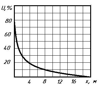 Из выражения (1) видно, что потенциал точек на поверхности грунта уменьшается с удалением от места замыкания на землю и в пределе стремится к нулю. Область поверхности грунта, потенциал которой равен нулю, называется электротехнической землей. Опытная кривая распределения потенциалов (рисунок 2), полученная непосредственными измерениями у трубчатого заземлителя, имеет примерно такой же вид, как и у заземлителя полушаровой формы. Из кривой (рисунок 2) видно, что поверхность заземлителя имеет максимальный потенциал. На расстоянии 1 м от моста стекания тока в землю потенциал снижается на 68 %. В конце десятого метра снижение достигает 92%, а на расстоянии 20 метров потенциал точек земли практически равен нулю. То есть сопротивление току замыкания на землю оказывает объем грунта радиусом 20 метров, находящийся в поле растекания тока. За пределами электрического поля грунт представляет собой проводник с бесконечно большим поперечным сечением и не оказывает сопротивления протеканию электрического тока. Практически «земля» в электрическом смысле начинается с расстоянием = 10-20 м от заземлителя.